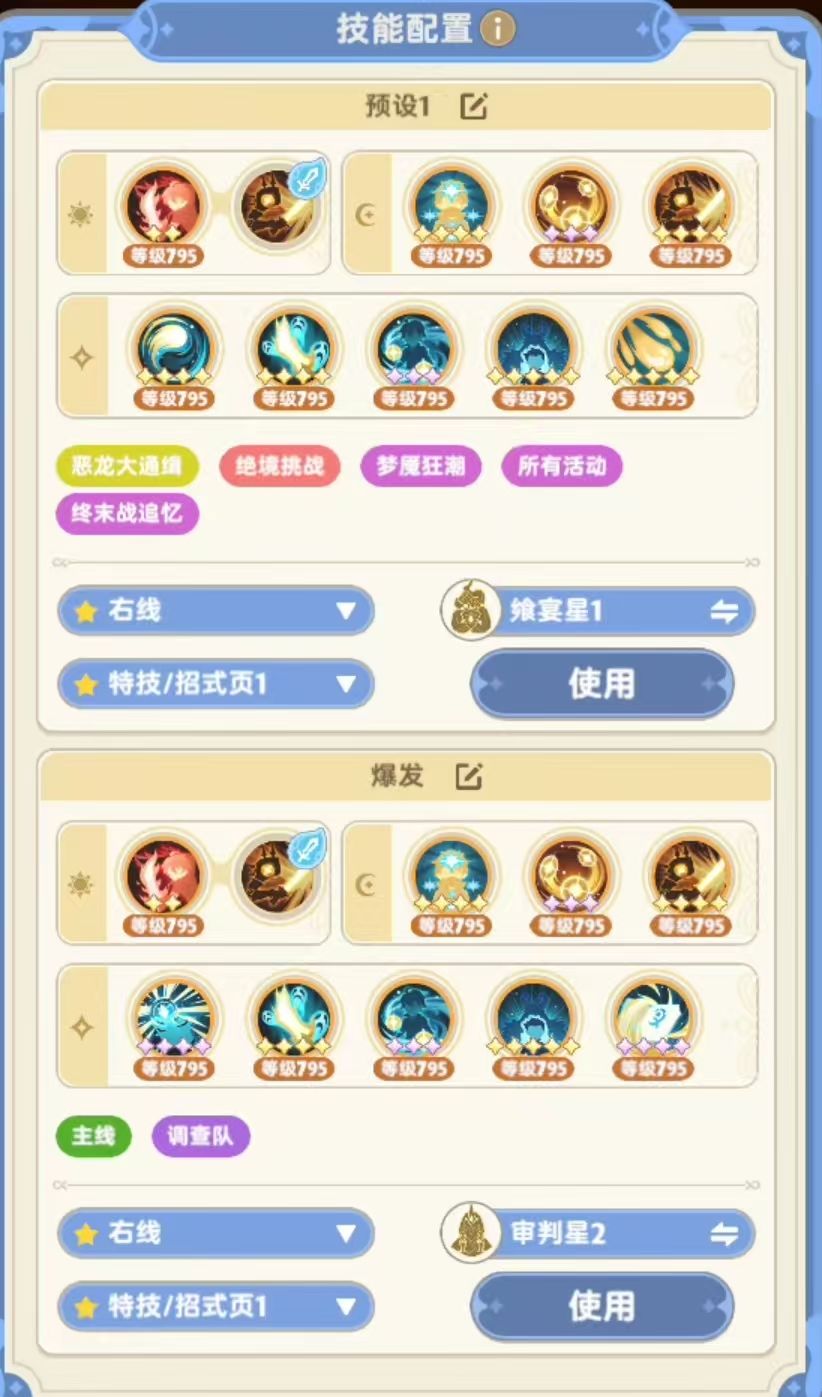 中长线可以带下面这套,残羹大概1分30秒叠满,3分钟以上就比之前强一些,5分钟的长线能比之前的要强35%左右,残羹和清虚绑定,不带清虚叠不满残羹。这套不建议手动放技能,有可能断残羹,推荐五步全自动,根据个人想法最多手动一下觉醒和星壳。