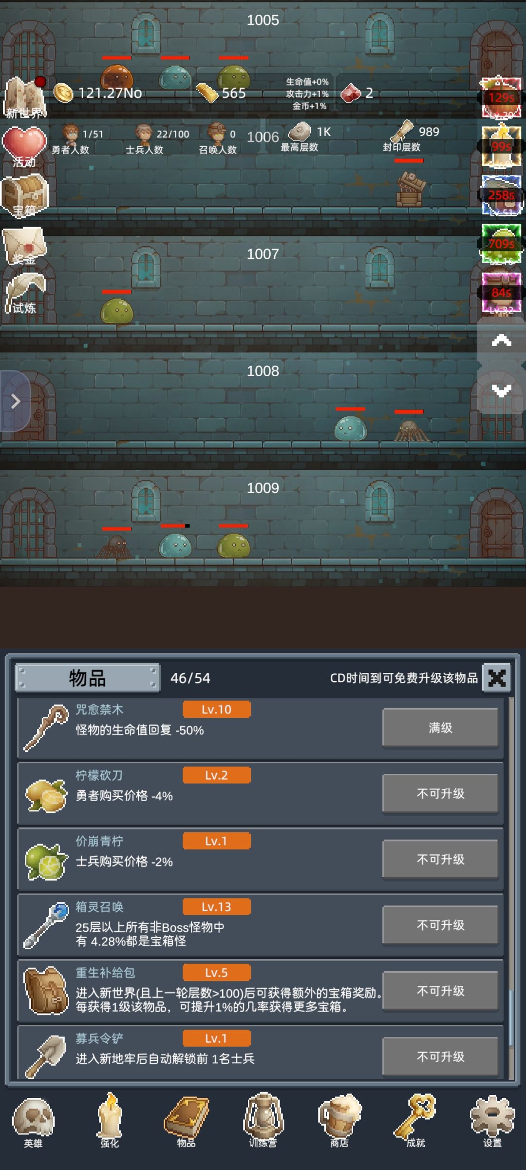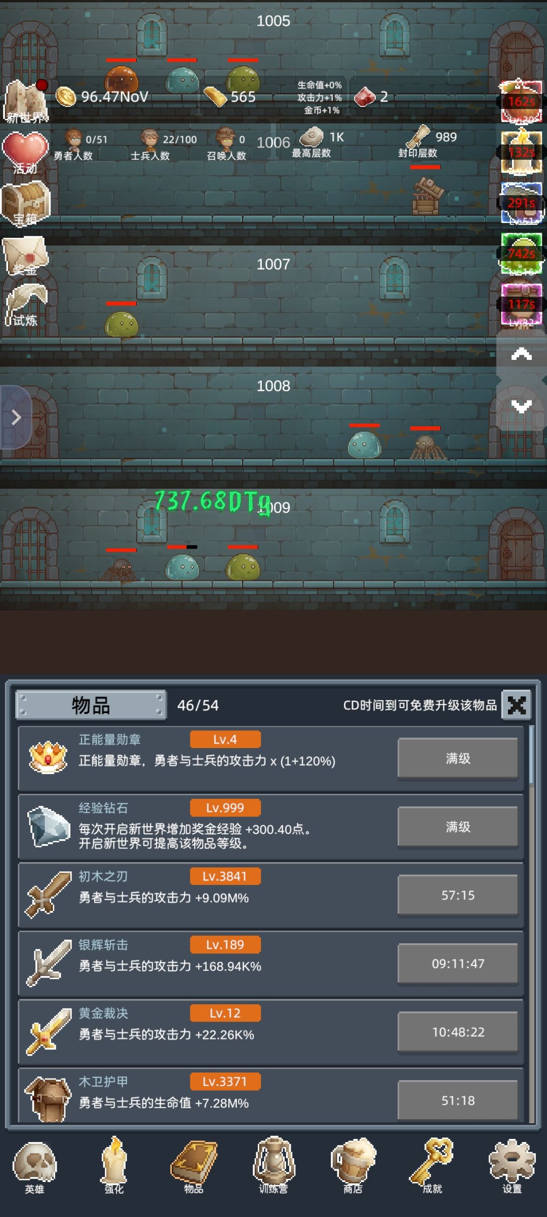 玩法首次爬关100关,金币10T开启新世界(也就是转生),10T金币比较困难,大概在105关时候,商店点金术单位T时候看广告,加速转生。转生到4转拿到赠送的正能量勋章,结合前文所述找助理私聊分享游戏动态获得的3个兑换码,满级。然后努力爬关突破一次150关,开启试炼(只要突破一次150关,以后每次转生都会开启试炼活动)能够转生的同时根据试炼任务获得金钻,红宝石等奖励。![[表情_吃瓜]](https://img.tapimg.com/market/images/d07b262774c8a022a7dddbc39683da6b.png)