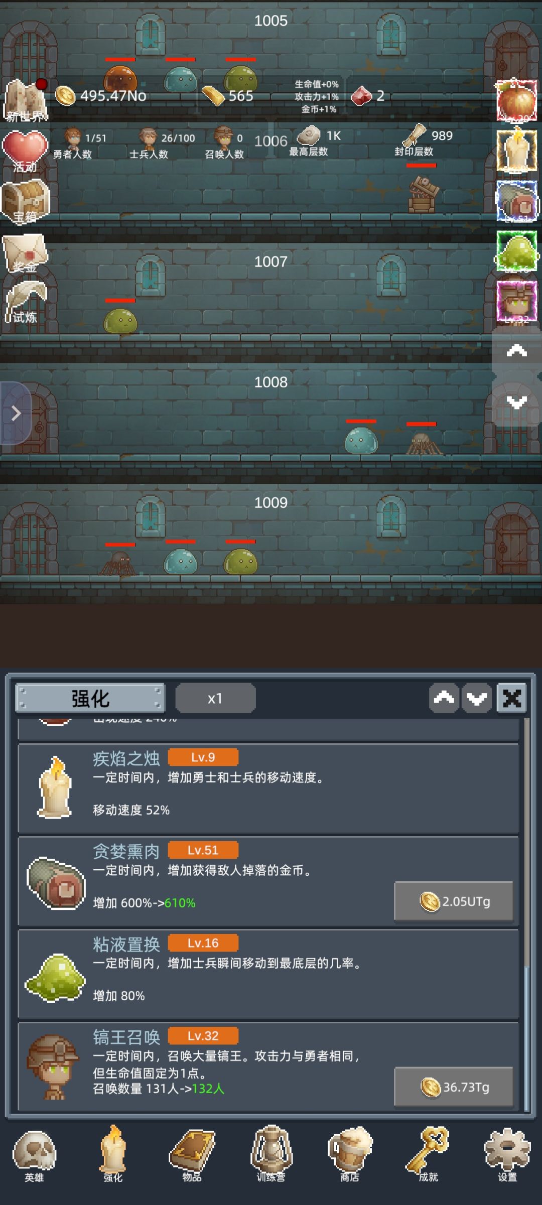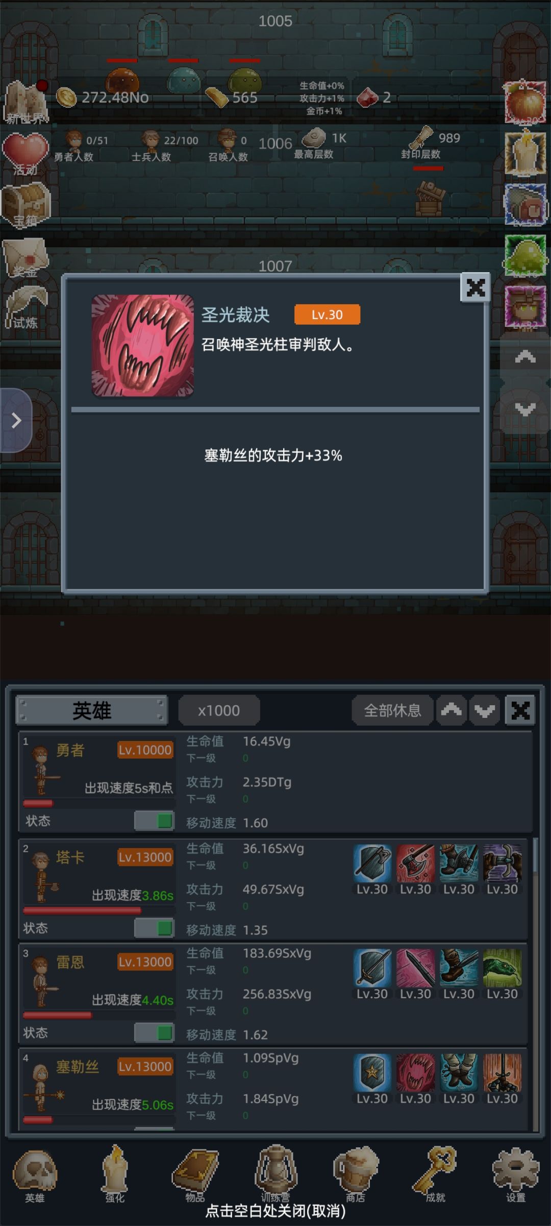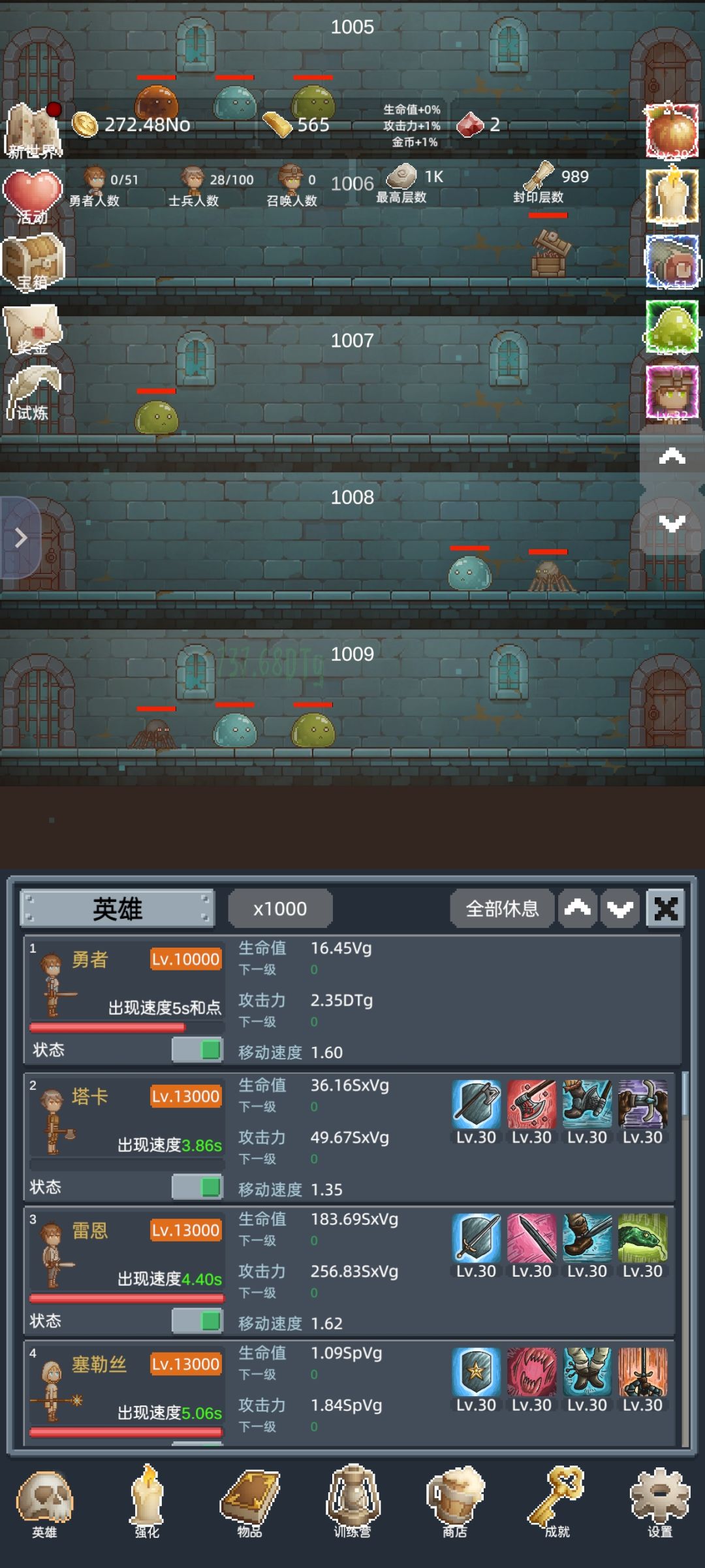 转生爬塔,在满足当期英雄闯关情况下存金币开下一个英雄,攻击力大幅上升。配合强化界面深渊魔晶,战阵结晶,召唤等技能 顺序开启。如果是速刷塔要配合主动技能,比如速刷100层,那就要在50-60层左右开启主动技能一波到结束。速刷120,150,200类同。目前勇者满级10000,英雄满级13000,英雄序列到33。