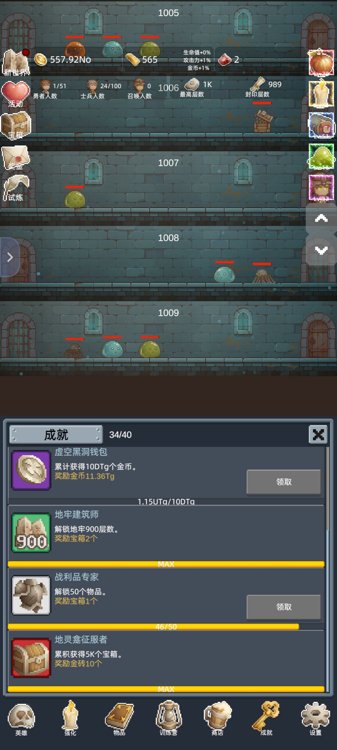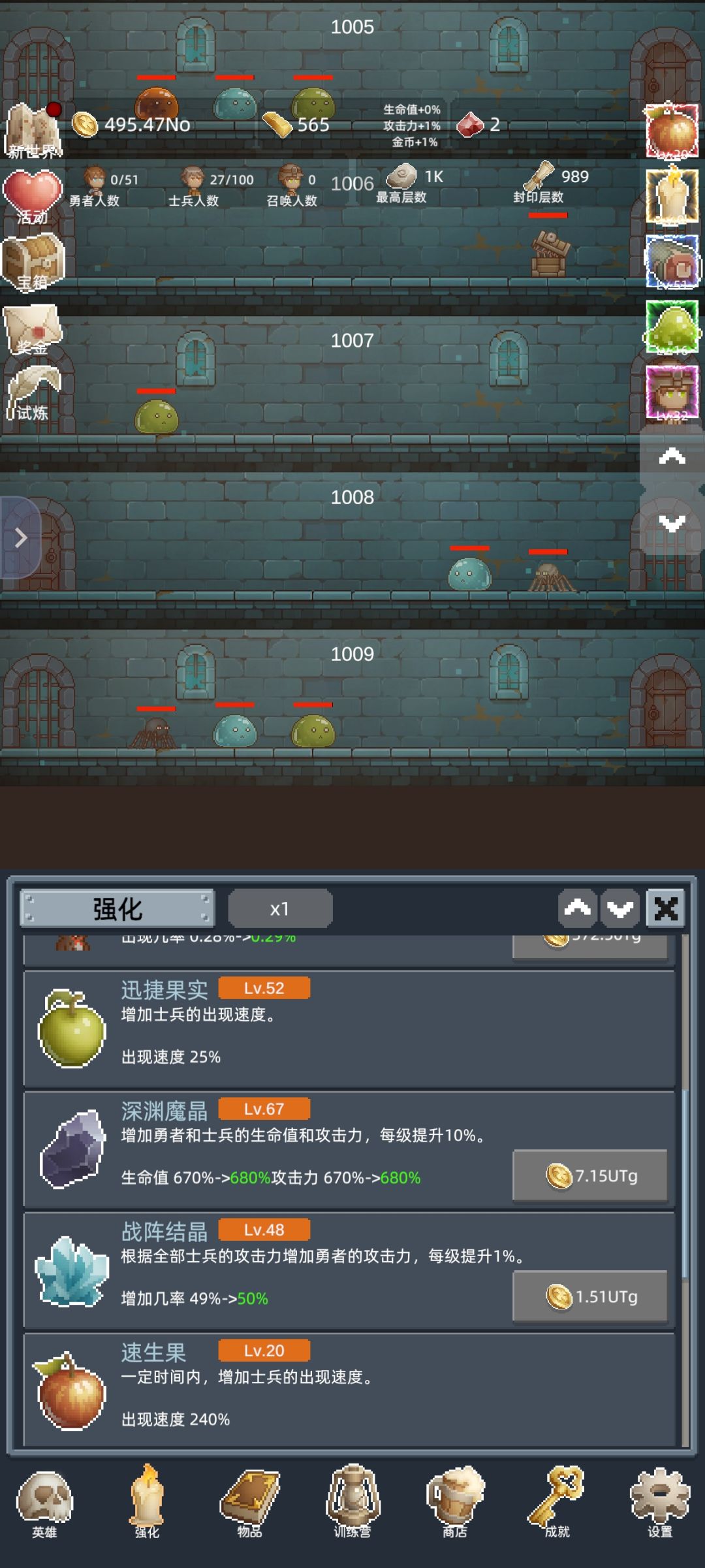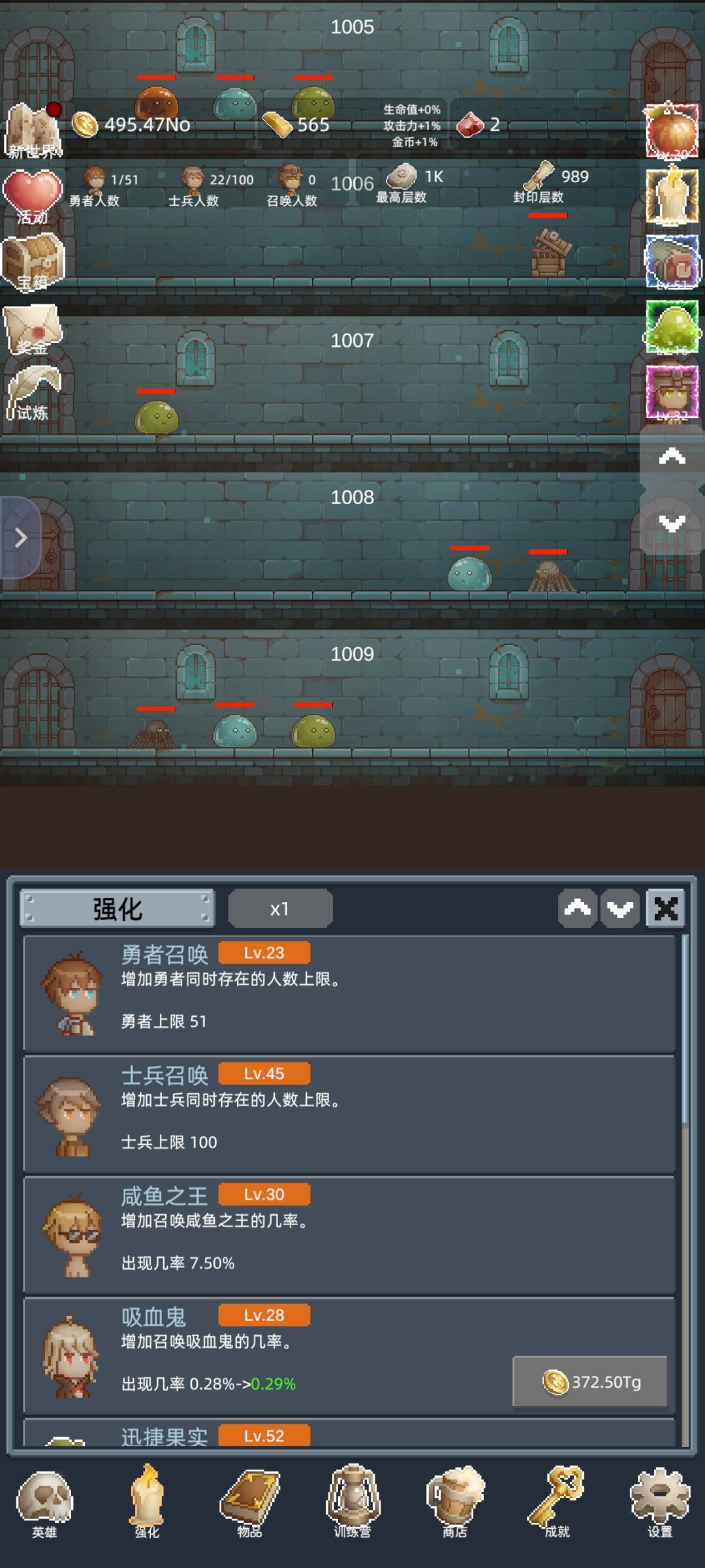 转生爬塔,在满足当期英雄闯关情况下存金币开下一个英雄,攻击力大幅上升。配合强化界面深渊魔晶,战阵结晶,召唤等技能 顺序开启。如果是速刷塔要配合主动技能,比如速刷100层,那就要在50-60层左右开启主动技能一波到结束。速刷120,150,200类同。目前勇者满级10000,英雄满级13000,英雄序列到33。
