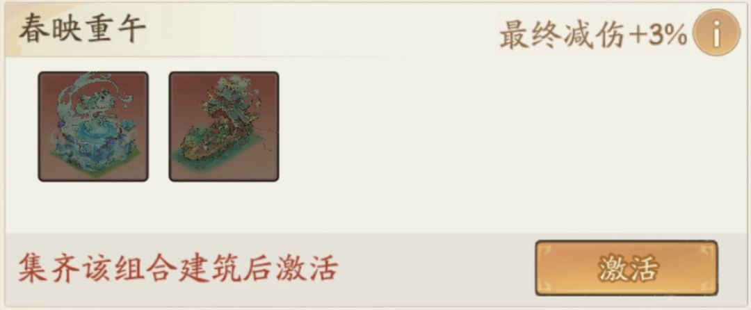 同时,「神渡龙舟」与「迎春锦鲤」可激活建筑套装【春映重午】,获得最终减伤效果~