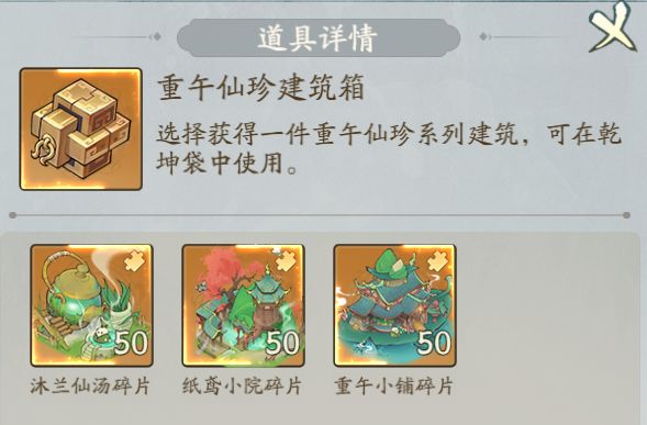 传说建筑箱「重午仙珍建筑箱」返场,包含:沐兰仙汤碎片、纸鸢小院碎片、重午小镇碎片。
