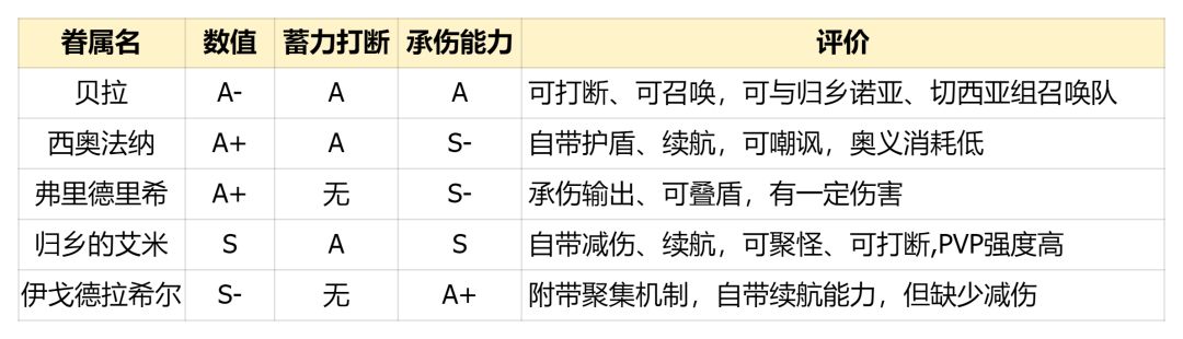 归乡的艾米本身数值较高,再加上奥义提供全伤害降低、被动提供受到法术降低,可有效提高自身生存,特别是法防特别高,可专门用来应对法术队伍。归乡的艾米是始祖,获取难度高、啖魂提升门槛较高,在大多数情况下我们用贝拉+弗里德里希/西奥法纳已经能满足承伤需求。