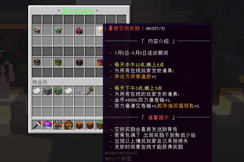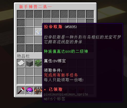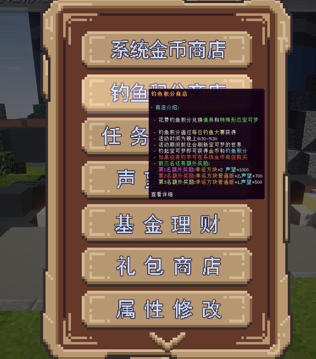 服务器特色:1️⃣每日签到,签到七天送究极异兽纸御剑 2️⃣在线空投,固定时间点送3️⃣神兽分解,百分百出幸运方块(概率出传说石板或无极陨星等稀有道具)4️⃣不禁任何道具,(特性膏药、王冠、薄荷)均可免费使用5️⃣主城开放祭坛和圣杯,供所有玩家使用召唤阿尔宙斯等极品神兽!6️⃣进服送神兽 无门槛送二选一拉帝欧斯或拉帝亚斯 7️⃣钓鱼大赛,每日举办钓鱼大赛 排名前三均可获得丰富奖励8️⃣排位系统,服务器提供排位系统让玩家进行对战并且获得丰富奖励