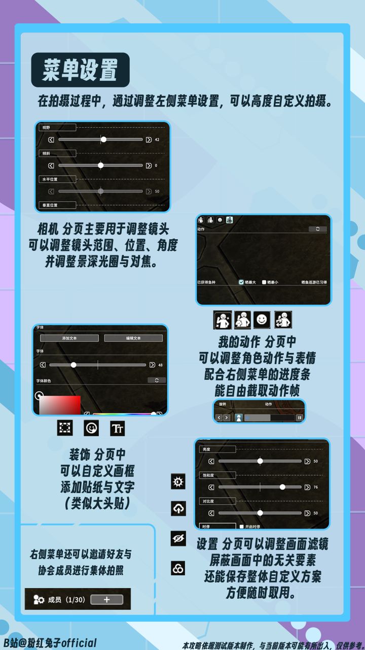 使用左侧菜单调整一些常见的相机参数,如镜头位置,景深与对焦等,善用这些功能对我们构图与制造画面空间感非常有帮助,例如拍照的时候也许可以试试把画面稍微倾斜一点的同时拉低视角制作出大角度的张力构图。又或者是在拍风景的时候找不到合适角度可以试着拉远视野来方便给画面放入更多场景,都是值得冒险者们一试的有趣功能