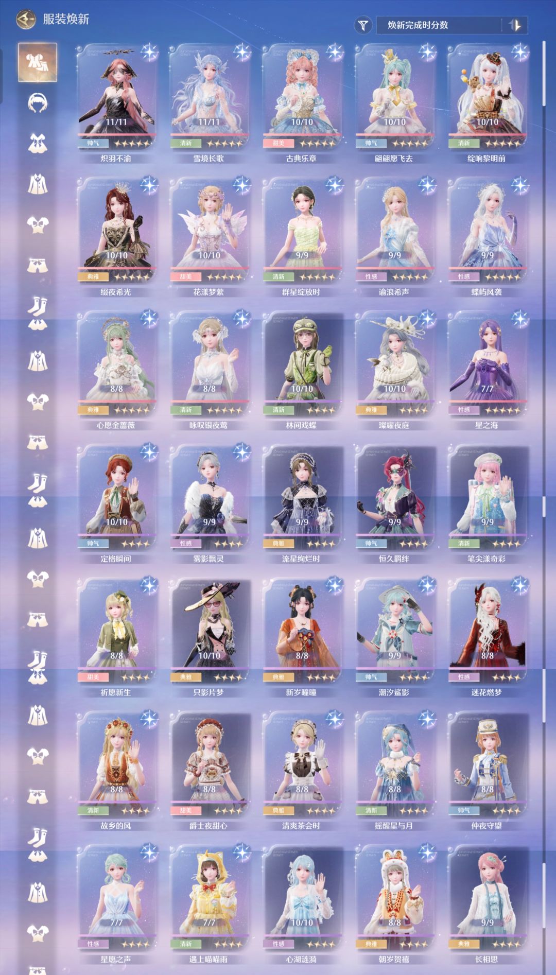 本人开服玩家 中氪党 看见喜欢的衣服就抽 目前有蝴蝶 金蔷薇满进 人鱼 飞鸟 星之海 二进 八音盒 花仙 纸鹤 气球 烟花套 每套差不多都是一进 普池浪花套 群星套二进 准备收集天鹅套 【还差一件就齐啦!】