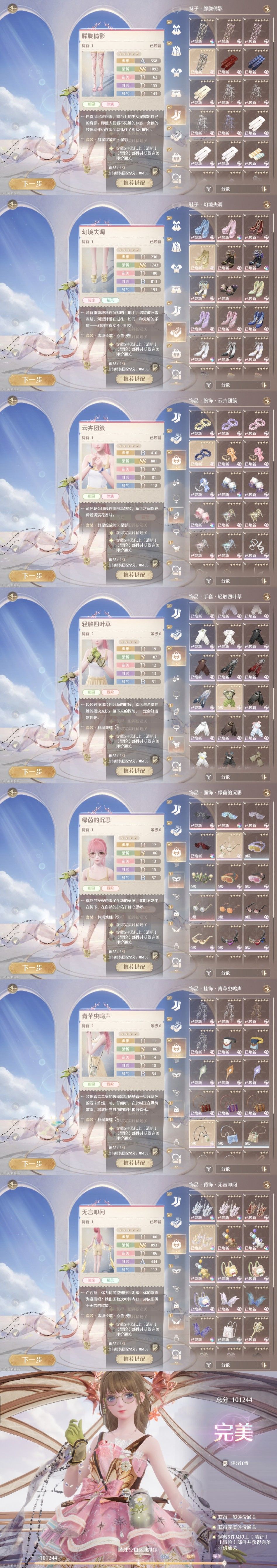 清新——雪境长歌【人鱼套】>落入泪之潮【蛇女套】>绽放黎明前【气球套】>群星绽放时【普池五星】>熠熠舞曲【商城蓝钻套】>咏叹银夜莺【主线任务套】>遇上喵喵雨【真心予你活动套】>林间戏蝶【普池四星捕虫套】