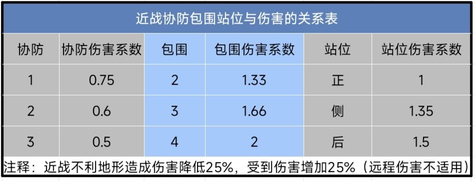 近战伤害受站位、地形、协防和包围影响,详情请看:输出公式(站位对输出的影响)