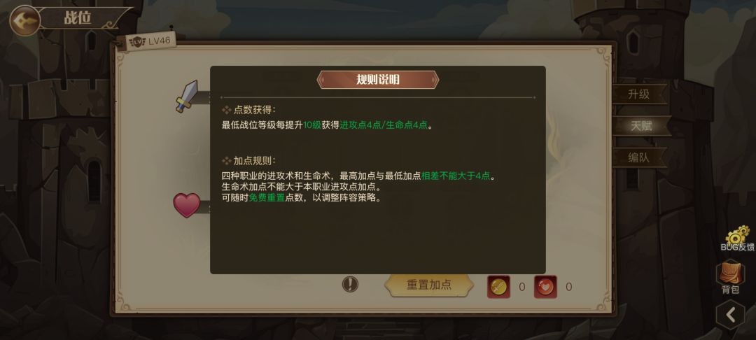 友友们通过升级获得的进攻点和生命点消耗,可以对应的给不同的职业进行天赋加点。(规则说明如上图所见)