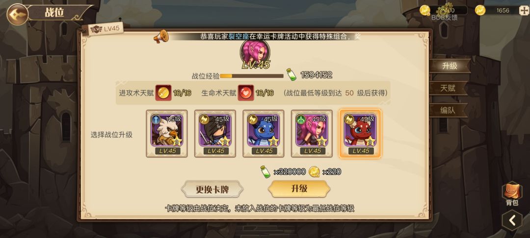 如上图所见,本游戏是包含五个战位了,友友们可以通过在游戏中获得的站位经验和流通币来对相应的站位进行升级。相应的站位升级后,后面友友所激活的所有卡牌都能吃到相应职业战位的相应等级。