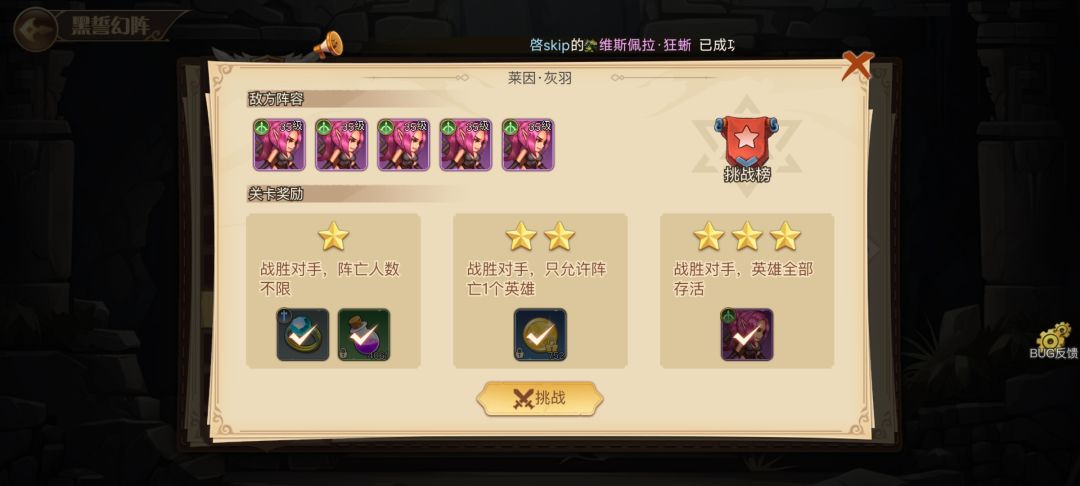 ps:这里小骷髅说一下自己过星级挑战的技巧:一、尽量手动操作。二、在遇到较难的关卡挑战时,先把加成食物吃上(通过生活技能可以获得)。三、遇到全射手关卡先卡射手身位。(射手被近身后会削弱攻击,除特定天赋英雄)