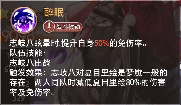 触发效果:志岐八对夏目里绘是梦魇一般的存在,两人同队时减低夏目里绘80%的伤害率及免伤率。