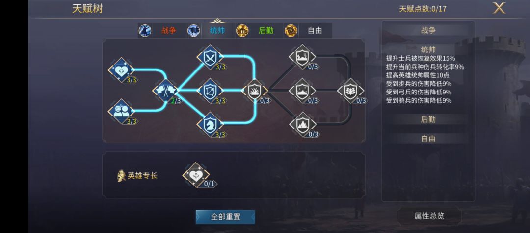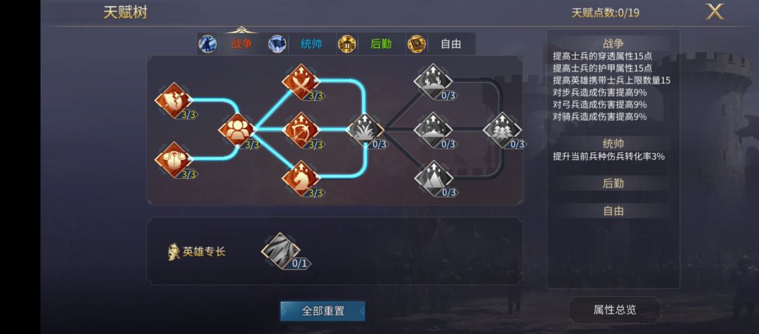 点开天赋可以看到四项内容:“战争、统帅、后勤、自由”,作为新手,我们只需要关注战争和统帅,大体思路,输出型英雄点战争,防御抗伤型英雄点统帅,当然,在英雄等级、星级比较低时,有几个加点技巧: