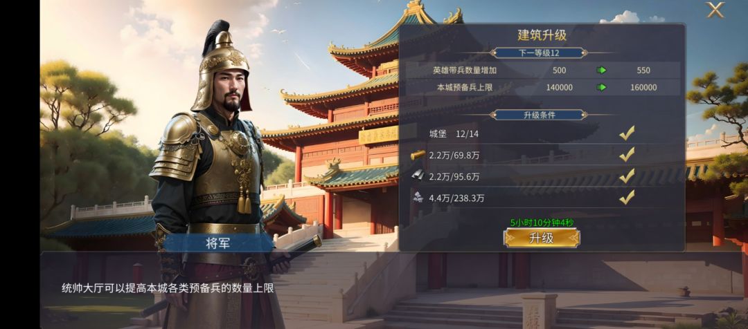 统帅大厅:可以增加所有英雄的带兵量,前期打银币、打副本(名将挑战)、打资源地、打城都会凸显出较为明显的优势;同时统帅大厅可以增加主城预备兵的数量;