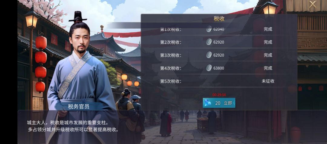 税收所:每天免费5次税收,税收所等级越高,英雄战力提升都需要消耗税收所获得的银币,运用好银币也是平民玩家在旅馆获得英雄的重要途径;