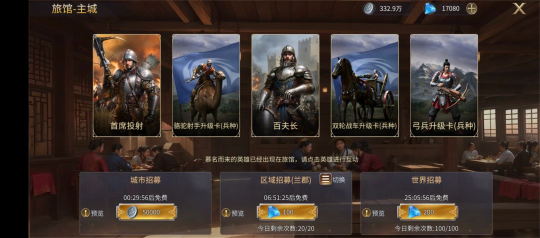 我认为策略游戏的本质,就是个集卡游戏,所有的游戏内容和资源奖励,最终都是为了获得好的武将,特别对于新手玩家,更为关注哪些英雄是强势英雄,哪些英雄可以让我更好的开荒,开荒第一步,能够在旅馆抽取到心仪的英雄,绝对能够让我们先人一步,所以对英雄之城的旅馆一定要有个了解,特别这里会有一些弯路,让新手玩家避免踩坑。