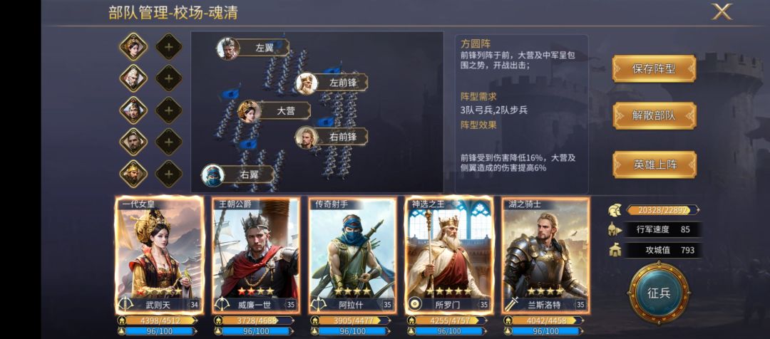 推荐搭配:武则天(大营)+白衣女王(侧翼)+任一五星弓兵+神选之王(前锋)+史诗英雄(前锋)
