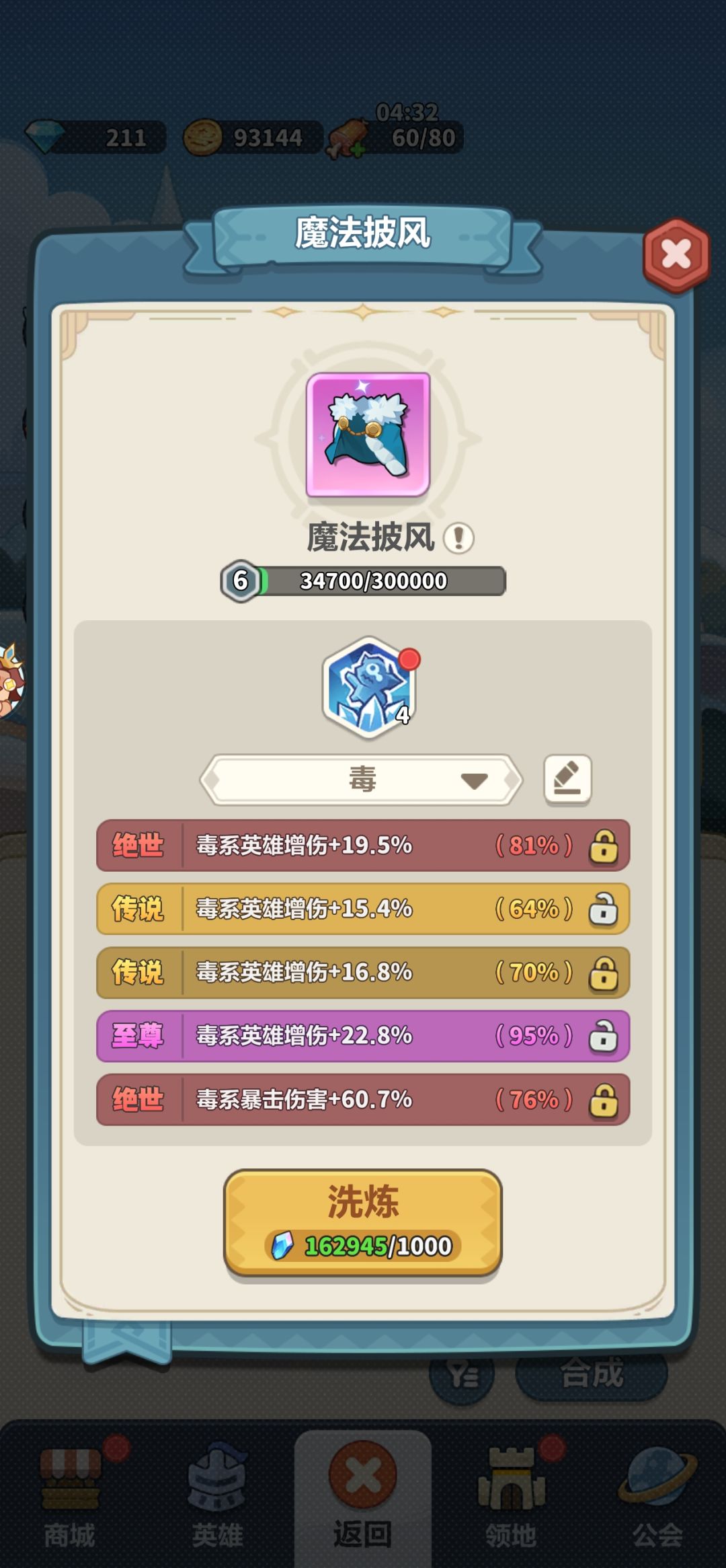 增伤类披风(用于推图,合作,竞技):洗练纯增伤披风,把毒,法师,战士,射手各洗练一套,例如我图中的毒增伤,配合图腾增伤轻松过百。纯增伤的好处是用扎扎实实的输出去过关,因为图腾洗练石的匮乏,暴击率忽略不计,将暴伤彻底舍弃。