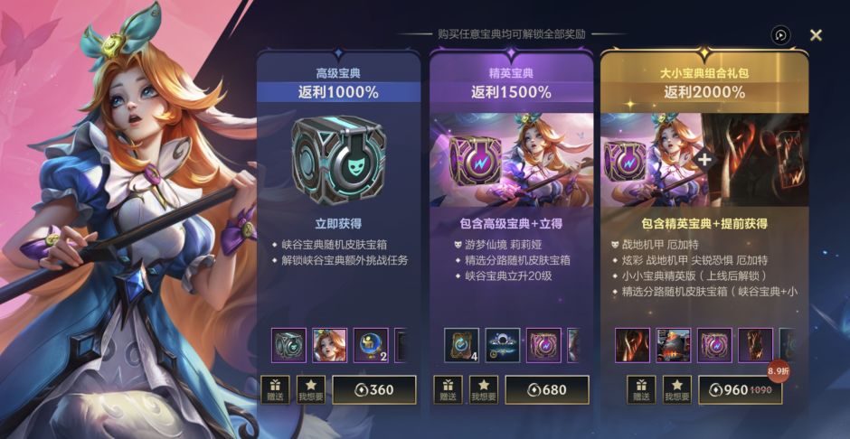 召唤师也可选择购买峡谷宝典,高级版峡谷宝典需花费360点券,精英版峡谷宝典则需花费680点券,不仅包含高级版峡谷宝典的全部内容,还可立即获得炫彩皮肤:游梦仙境 异想天开 莉莉娅、精选分路随机皮肤宝箱、峡谷宝典立升20级!