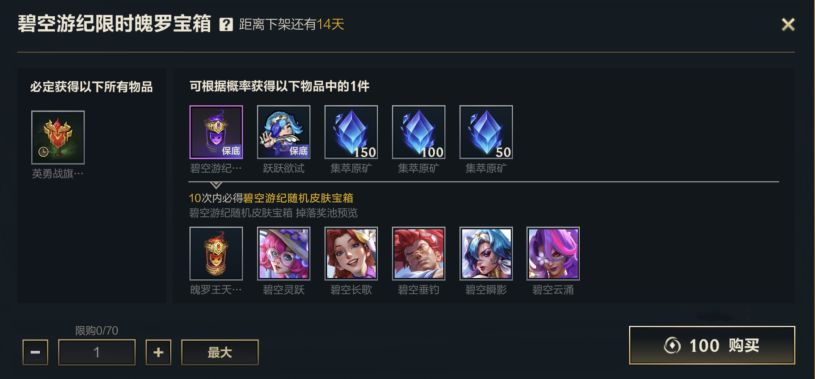 此外,碧空游纪限时魄罗宝箱也在同步热卖中!即日起至7月30日23:59,召唤师使用100点券开启宝箱,即可获得英勇战旗-金牛战旗(1天),还有机会获得碧空游纪随机皮肤宝箱、局内动态表情-跃跃欲试和集萃原矿好礼~