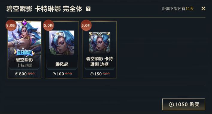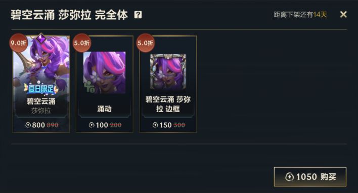 同时,即日起至7月30日23:59,召唤师还可以1050点券的优惠价格分别购入碧空垂钓 亚索 完全体礼包、碧空瞬影 卡特琳娜 完全体礼包和碧空云涌 莎弥拉 完全体礼包,礼包内包含9折优惠的各英雄皮肤,更有5折优惠的各皮肤姿态、皮肤边框。