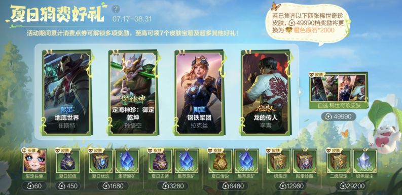 即日起(版本更新后)至8月31日活动期间,召唤师在游戏内使用点券进行消费且达到指定数额时,可分别解锁对应档位奖励!至高可领7个皮肤宝箱及超多其他好礼!