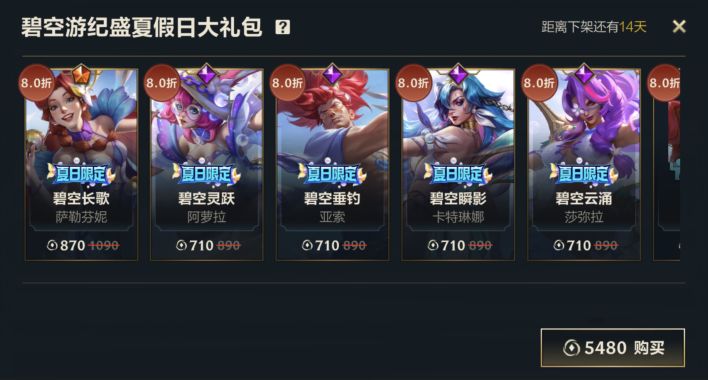 即日起至7月30日23:59,召唤师可前往商城,使用5480点券获取碧空游纪盛夏假日大礼包!礼包内包含8折优惠的碧空长歌 萨勒芬妮、碧空灵跃 阿萝拉、碧空垂钓 亚索、碧空瞬影 卡特琳娜、碧空云涌 莎弥拉共5款新皮肤以及精英姿态-驭空飘摇,还包含对应皮肤姿态、皮肤边框和头像-泡沫盛夏等5折好礼~