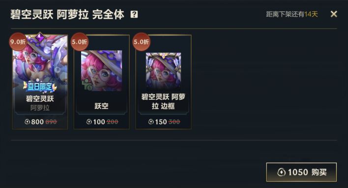 碧空灵跃 阿萝拉 完全体礼包限时优惠出售中!即日起至7月30日23:59,召唤师可以使用1050点券购入完全体礼包,礼包内包含9折优惠的碧空灵跃 阿萝拉皮肤,更有5折优惠的皮肤姿态-跃空和皮肤边框-碧空灵跃 阿萝拉。