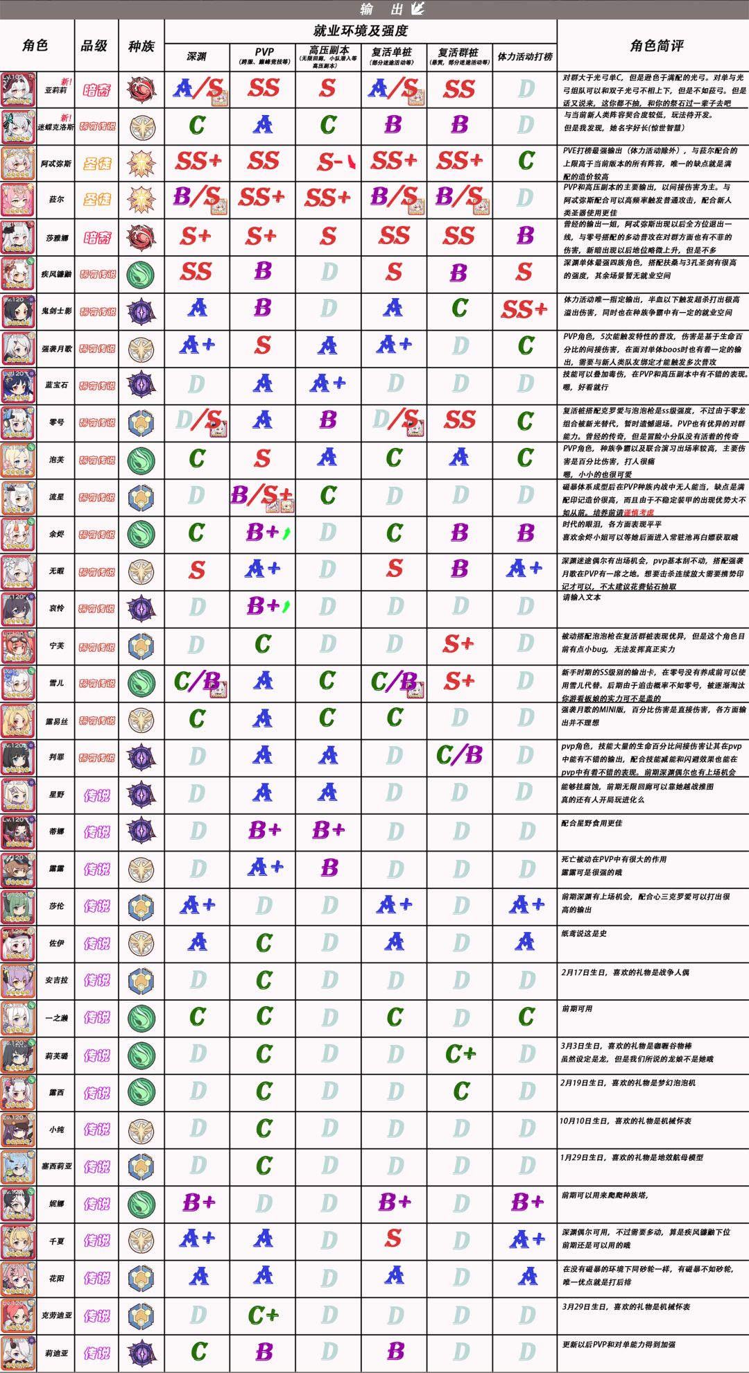 关于强度表的变动,由于上次光弓出的时候没有高压副本,实测以后发现她在高压副本的表现远不如菈尔,所以进行了强度下调。这次的新暗也一样,高压副本的强度待定,其余角色则没有什么较大变动。