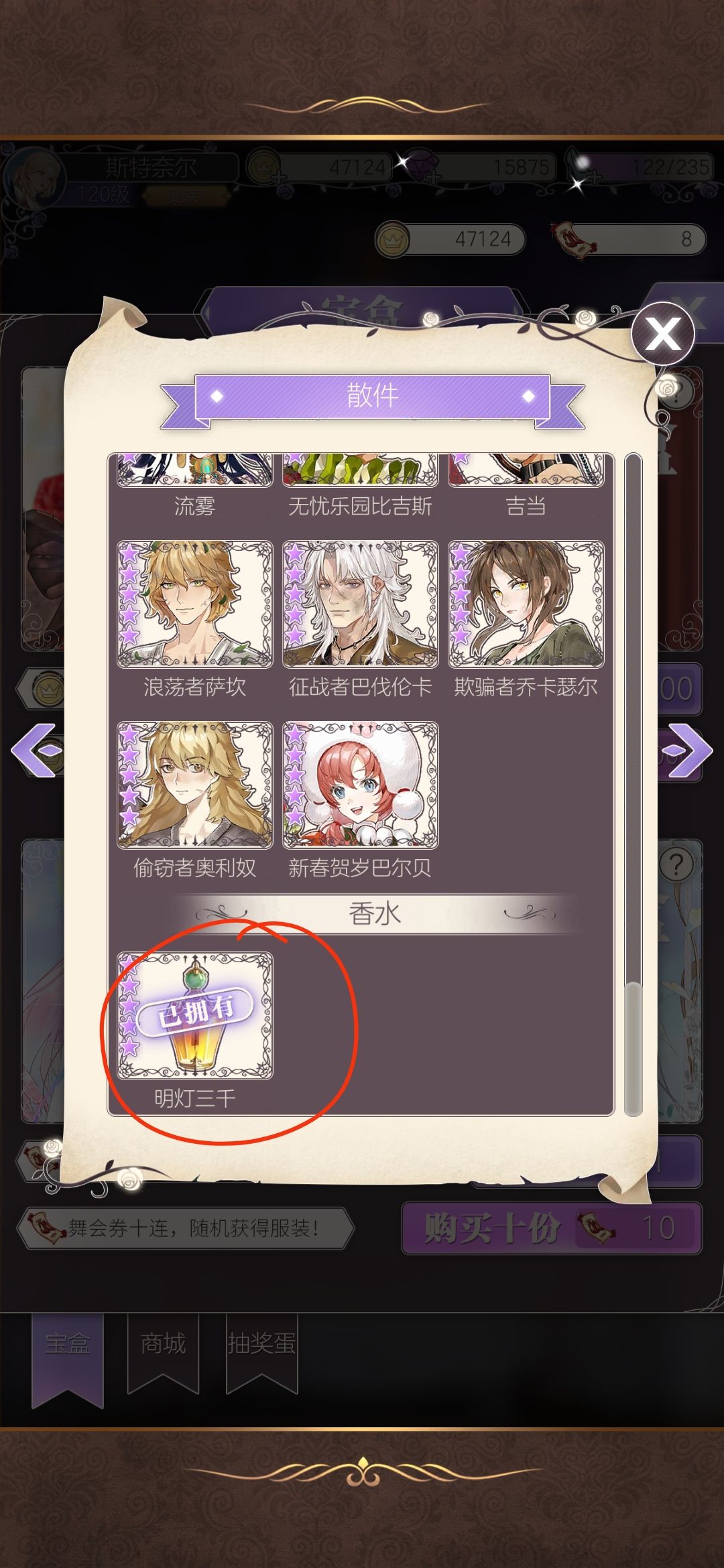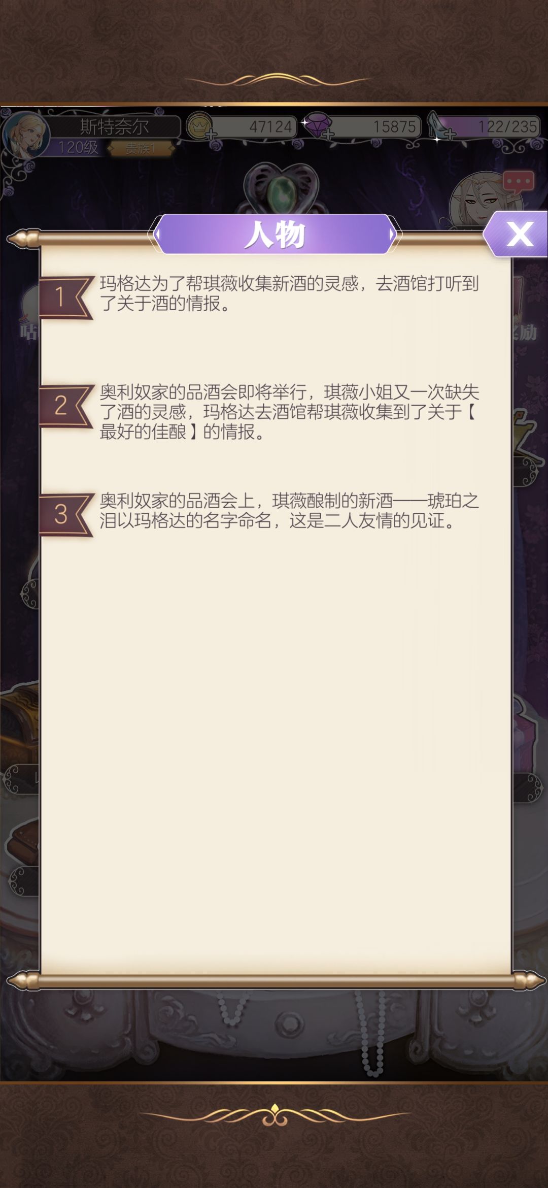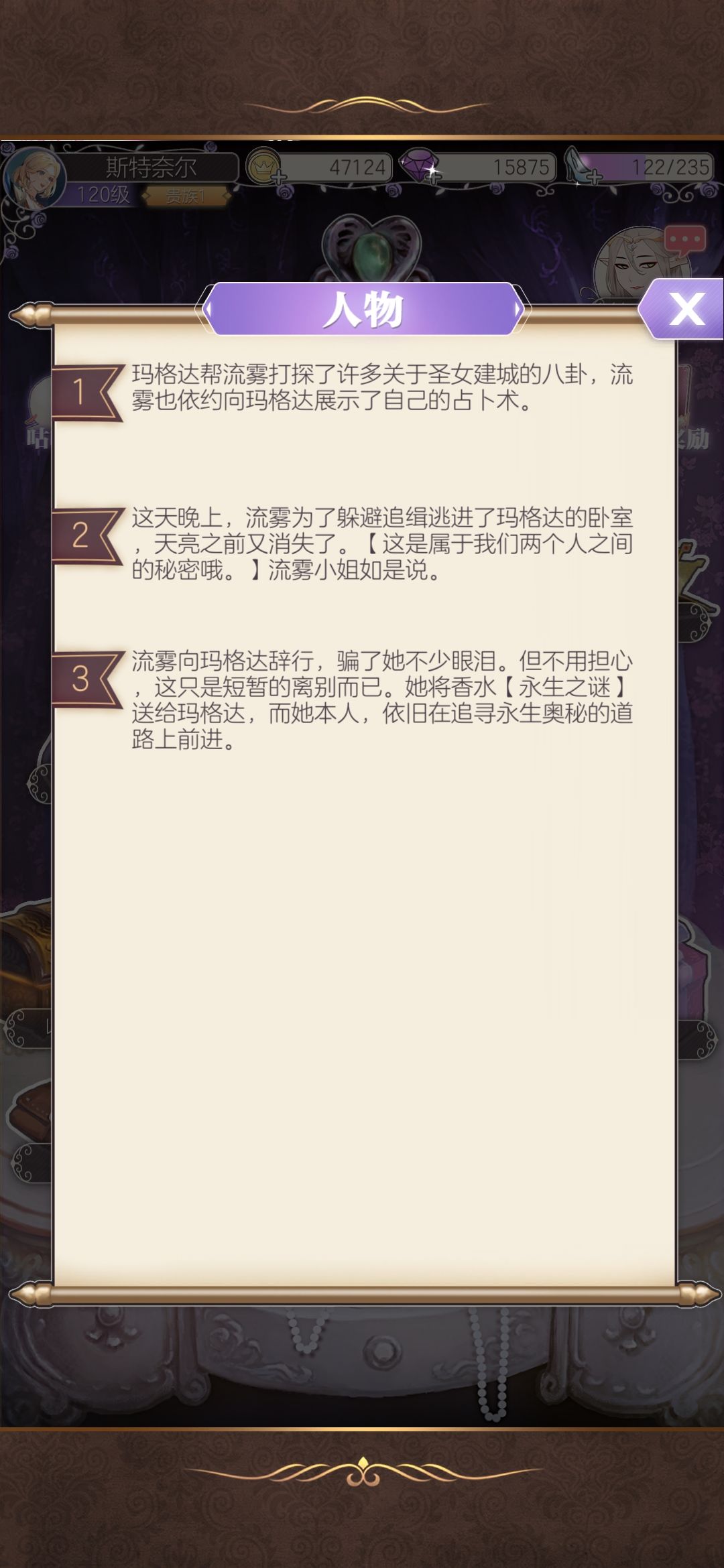 获取方法:流雾满好感,完成流雾好感任务最后一个任务。与琪薇的香水不同的是,流雾前两个任务要分别询问三个人消息(加起来就是六个人)要自己去随机舞会找相应角色,所以体力消耗比较随机和大,大概要两三百体力,所以建议大家体力有空闲的时候再去做流雾的好感任务哦。
