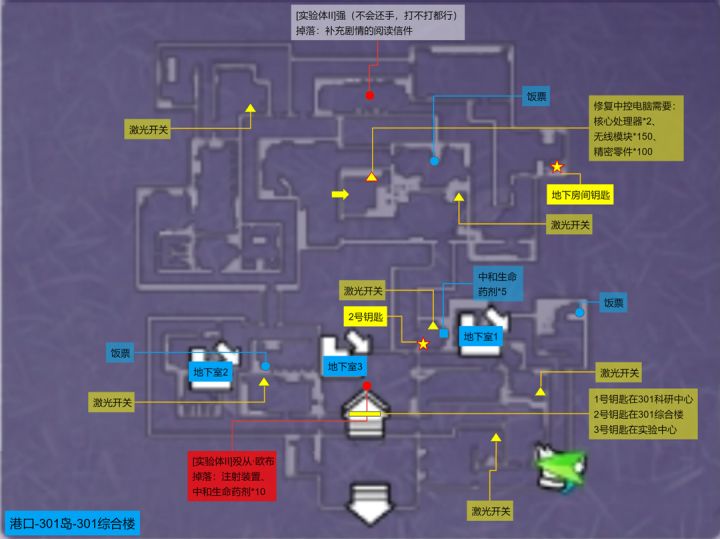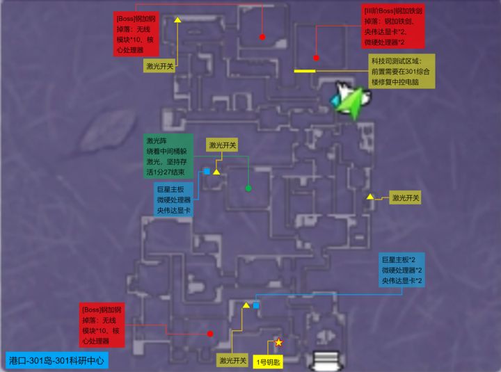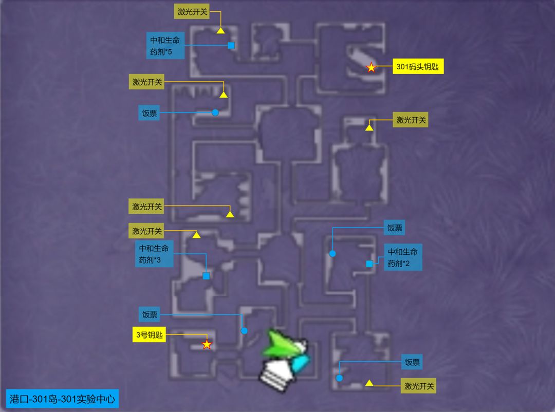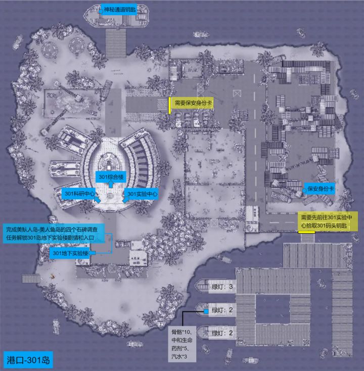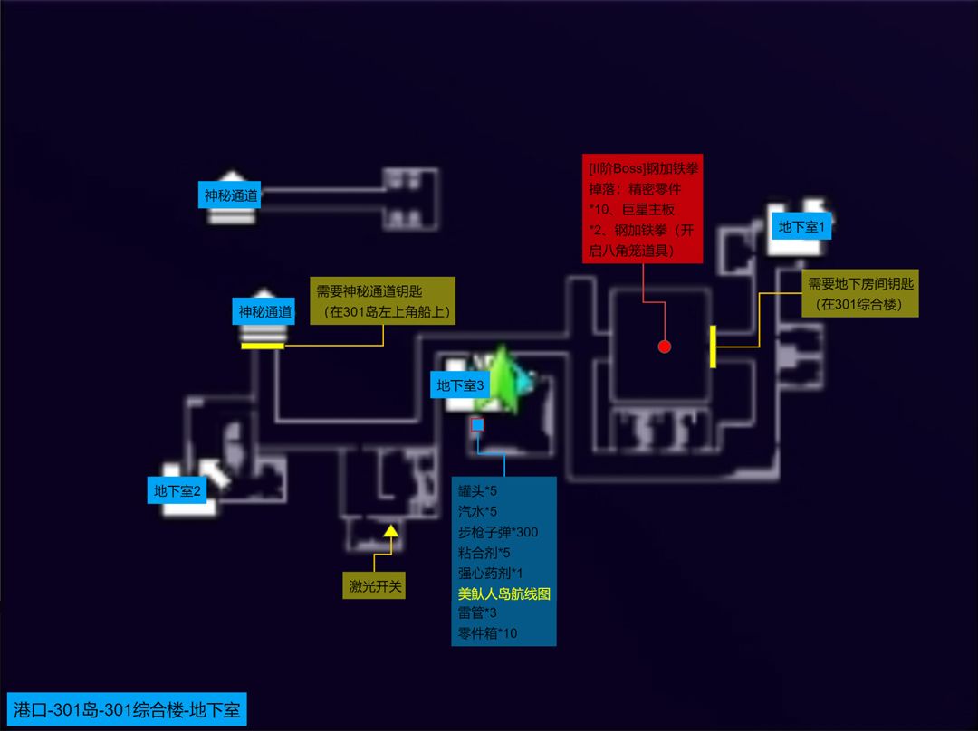 含全301岛钥匙/301综合楼/301科研中心/301实验中心/301岛码头/钢加铁拳位置/钢加铁剑位置/美魜人岛航线图