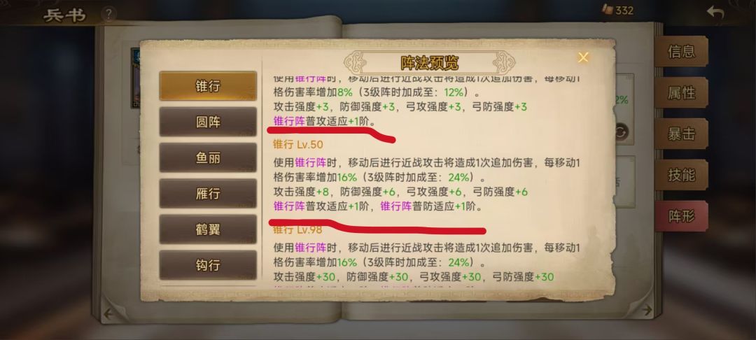 在兵书-阵形-阵法页面,点击左下角的满,会出现介绍,说某某适应性+1,这个就等同于一级阵升二级阵那个字母等级的提升,但是只升25级就只享受一条哦。