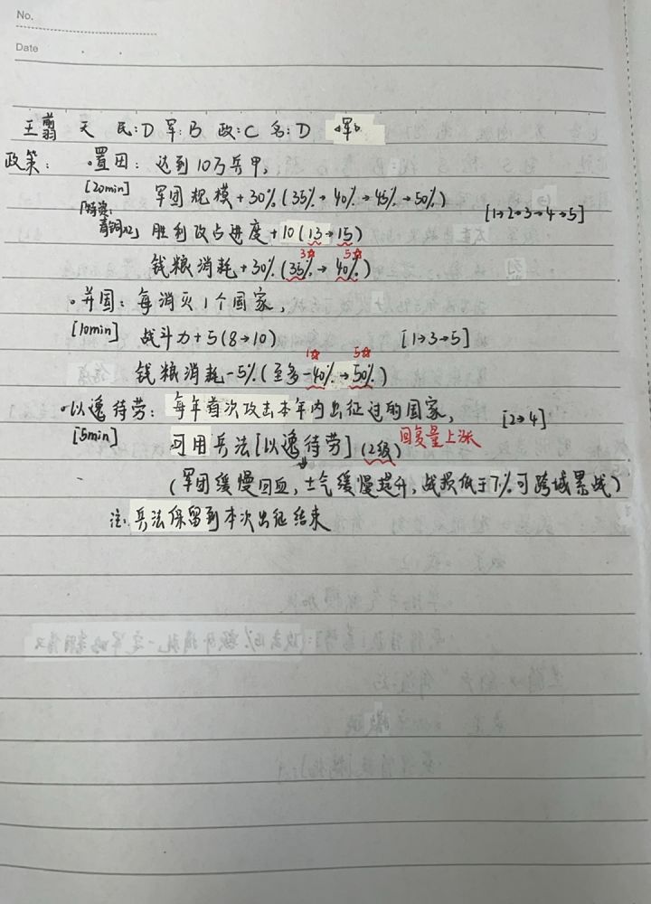 王翦-最大的问题在于置田消耗加的太多了,所以我尝试通过二政策并国来减置田的消耗。最后就是我认为天级名臣还是应该有3个政策所以加了个以逸待劳。![[表情_开心]](https://img.tapimg.com/market/images/48516f625646b5ea2c66f0cab3c9c52a.png)