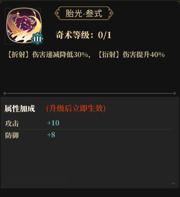 胎光:降低【折射】的伤害衰减,提升衍射的伤害。不推荐使用,收益太低。