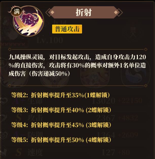 ③特殊效果——「九凤专属」当【九凤】在场时,九凤有10%/12%/14%/16%/20%/30%的概率反射减益效果