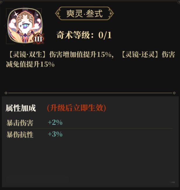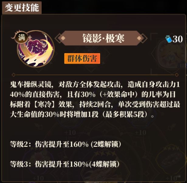 胎光:【镜影·断魂】攻击降低效果提升,【镜影·极寒】伤害提升,首推奇术,进一步提升极寒的伤害,最高能造成1440%攻击的全体伤害。