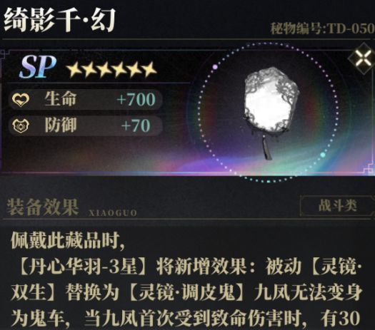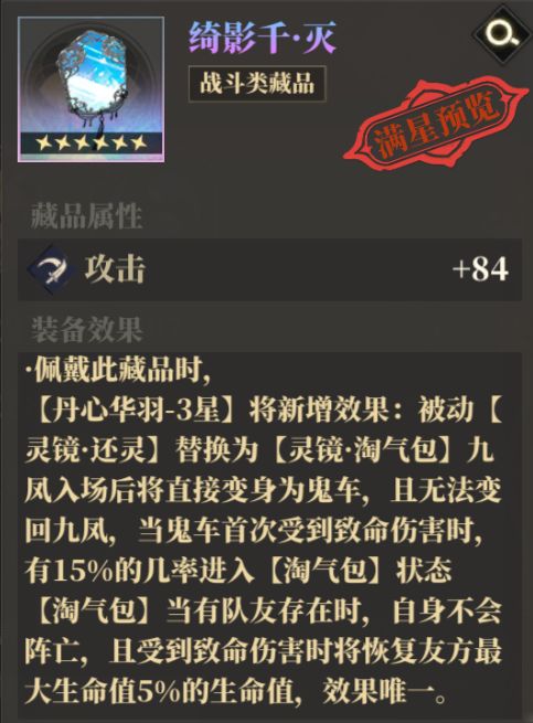 佩戴此藏品时,「丹心华羽-6/5/4/4/3/3星」将新增效果:被动「灵镜·还灵」替换为「灵镜·淘气包」九凤入场后将直接变身为鬼车,且无法变回九凤,当鬼车首次受到致命伤害时,有5/5/5/10/10/15%的几率进入「淘气包」状态