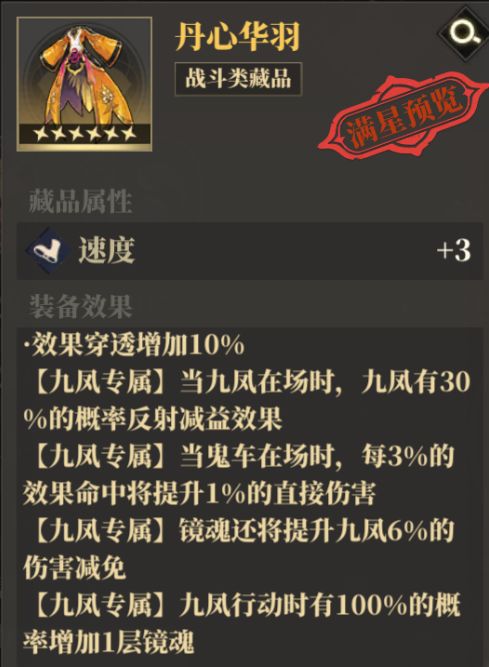 收藏加成给了速度,携带能提高效果命中。九凤状态下提供反射减益效果,攻防一体,同时行动时能增加镜影层数,增加镜影提供减伤的效果。而在鬼车状态下效果命中能提升直接伤害。
