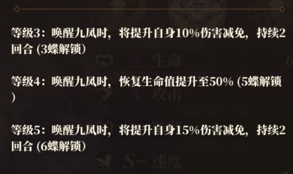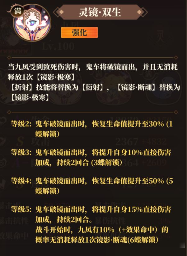 ⑤特殊效果——「九凤专属」九凤行动时有30/60/100%的概率增加1层镜影(2/4/6星)