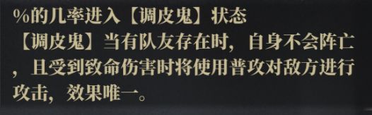 「淘气包」当有队友存在时,自身不会阵亡,且受到致命伤害时将恢复友方最大生命值5%的生命值,效果唯一