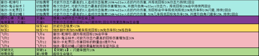 完全契合于闪避队伍的增益帮助,具有强力的弱敌手段,降命中、降免伤、降攻击是有效克敌手段;基础的优势不差,根骨上是辅助极佳的超级生命底子,突破14额外增加闪避,受击的定量回血和闪避提升是有效的续命手段,是闪避队的站队核心,但是有更强的战士在场会有更佳效果。
