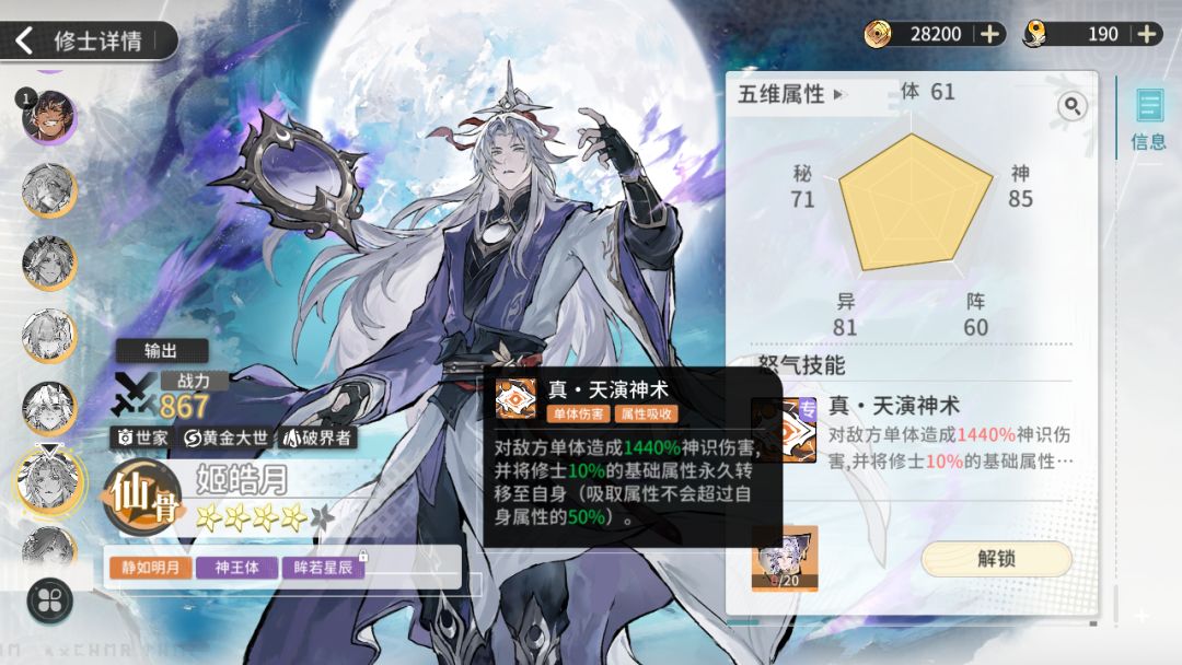 世家增益5%全属性,变为2%,前三回合最高攻击回复1点怒气,姬皓月单体技能伤害增加200%多,从1260%变为1440%,勉强能玩