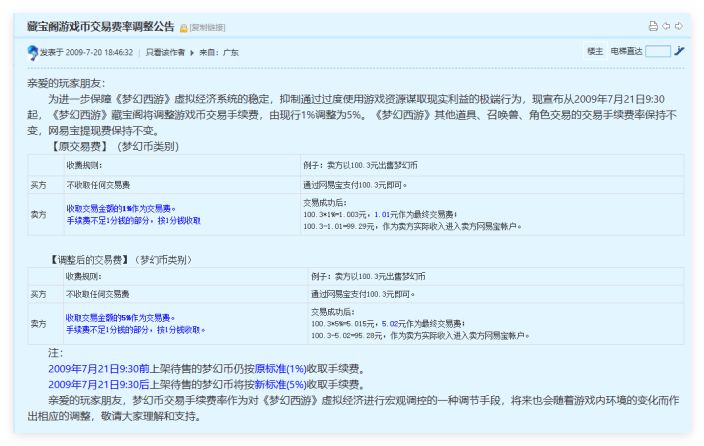 藏宝阁的手续费自开服起便逐渐上调,比较出名的实在2009年7月实施的藏宝阁游戏币交易费率调整,将游戏币交易手续费由1%调整至5%。以官方的话来说,这种方式也是“对《梦幻西游》虚拟经济进行宏观调控的一种调节手段”。
