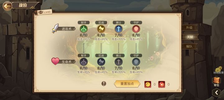 如图,组一个单一阵容再配一个单一天赋,比如说英雄骑士较多,就组一个五骑士或者四骑士带弓箭的队伍配合如图天赋。也许训练道具不够但是天赋加成应该够了。就算组平常队伍训练道具也是不够用的,再说幻阵想三星离不开属性碾压的。所以天赋加成很实用。