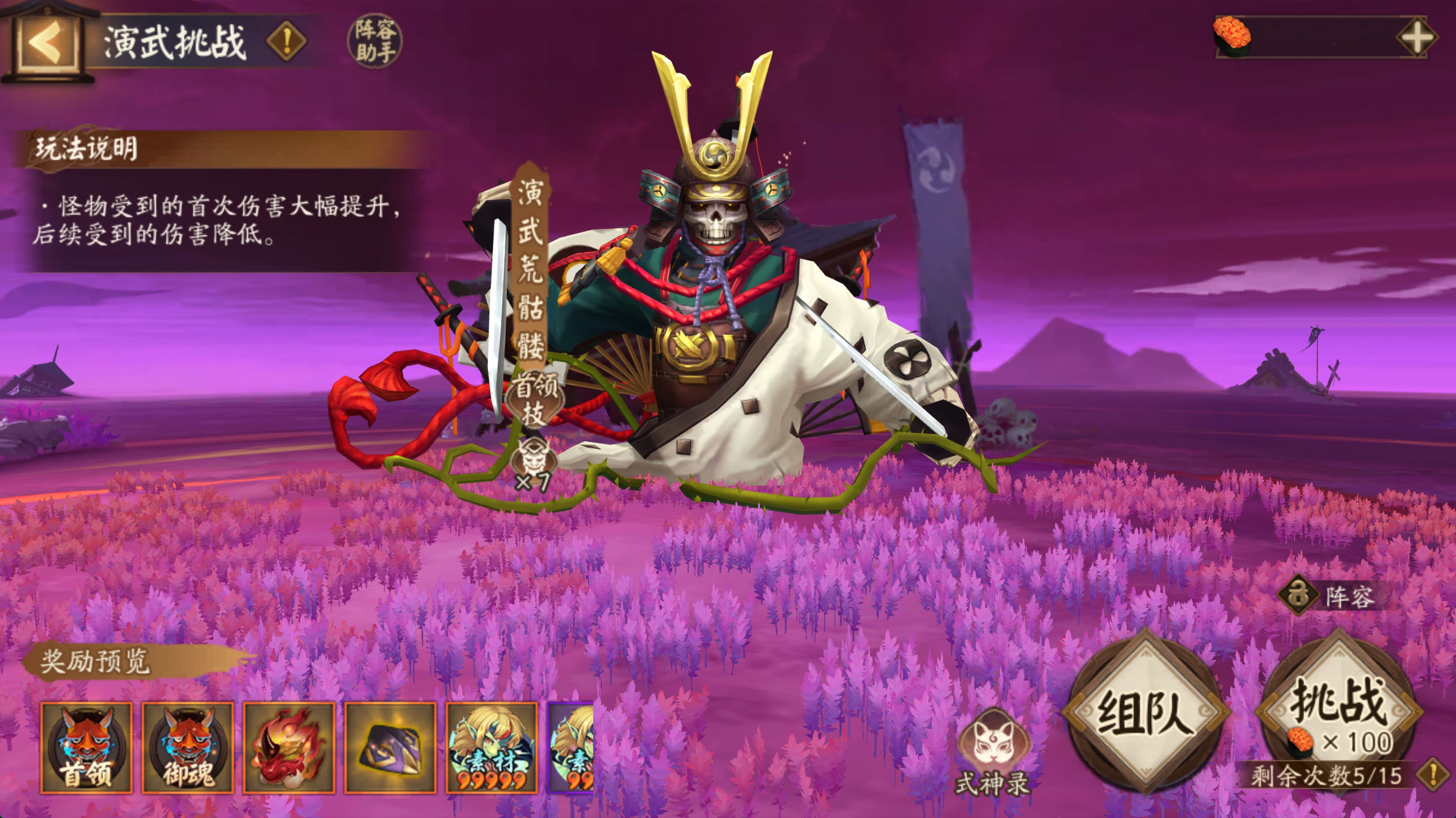 ※「演武挑战」:活动期间,大人可消耗100体力挑战「演武荒骷髅」,每日可获得5次挑战次数,最多可存储15次。大人还可选择组队协力迎战,所有队伍成员均可获得和单人挑战成功时相同的基础奖励,并且还将根据组队人数额外获得五星青吉鬼。