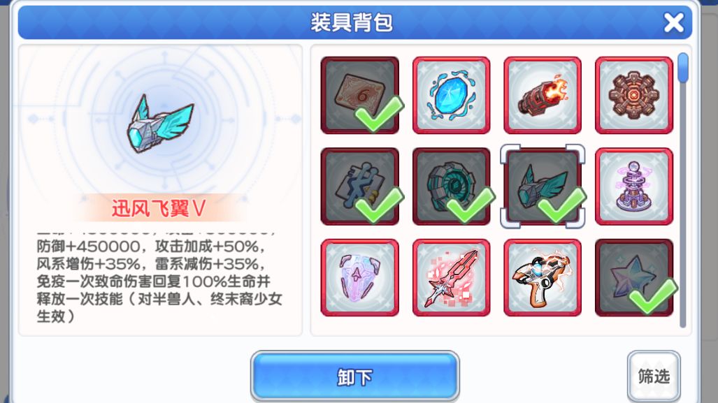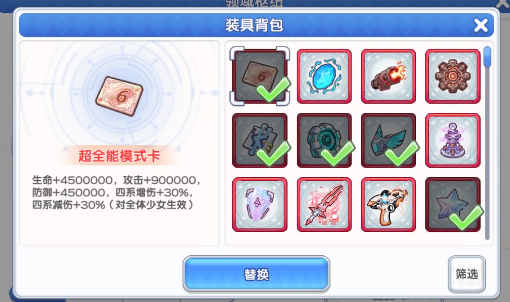 - 还有一部分全能装具需要打过部分关卡才会获得,这些属性非常好 ,属于必带(超全能模式卡 超认知芯片 超神秘星光 临时的守护等 )