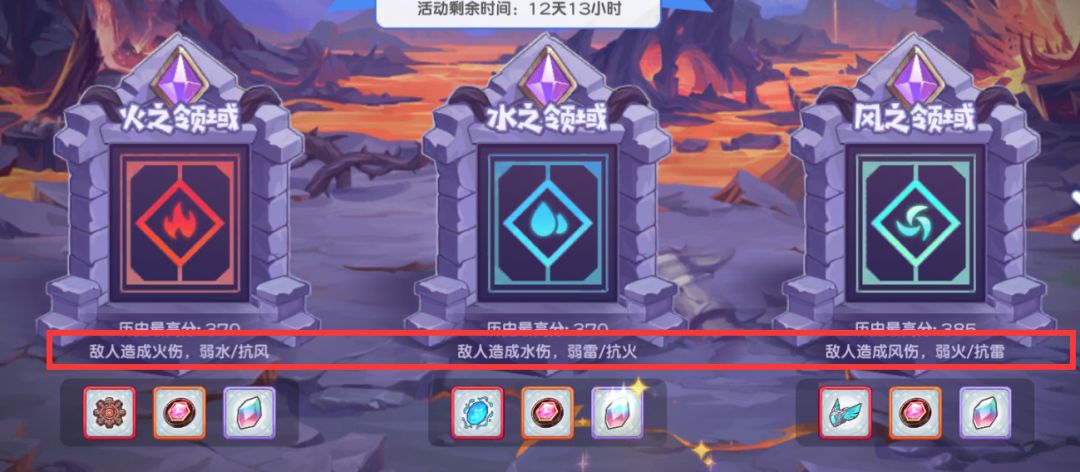 - 火之领域:敌人弱水元素(抗性低)、抗风元素(抗性高),受到火元素攻击时,我们需重点用水元素输出。