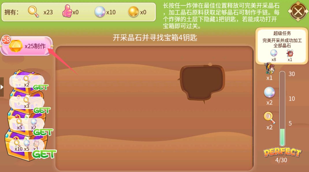 开采后,点击晶石原料,寻找宝箱钥匙通过各个关卡。
