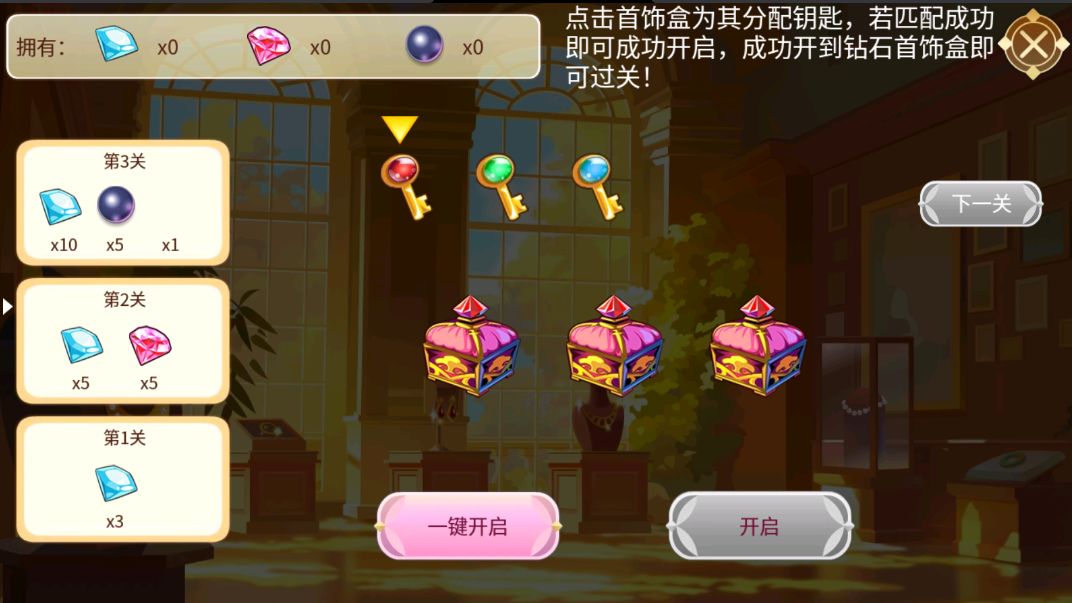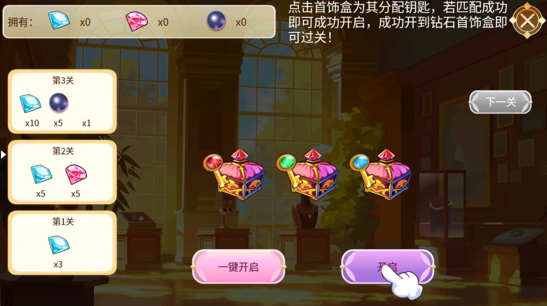 点击钥匙,为首饰盒进行分配,开启首饰盒获得奖励以及钻石、珍珠积分~