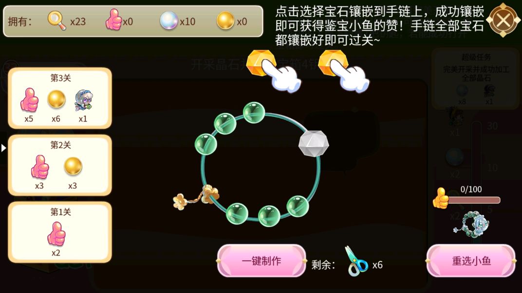 点击选择宝石镶嵌到手链上,完成制作获得赞、珍珠积分,就可以进入下一个环节啦!